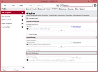 novaPDF Pro har många funktioner som gör att du kan: ändra pappersstorlek (eller skapa nya anpassade sidstorlekar för utskrift i stort format), ändra upplösningen (från 72 till 2400 dpi), ändra sidriktning (stående, liggande), bädda in teckensnitt, komprimera text och bilder, skicka den genererade PDF-filen via e-post och mycket mer. Användargränssnittet är översatt till flera språk.